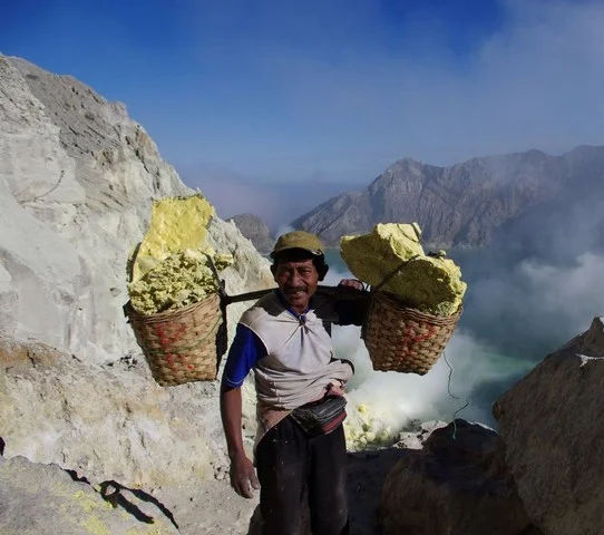 - Pentru 10 - 15 dolari pe zi, salariu considerat destul de mare în Indonezia, localnicii extrag Sulf cu o puritate ridicată în condiții extrem de riscante din fumarolele Craterului Ijien din estul insulei Java. Ei cară 2 sau 3 încărcături pe zi, fiecare încărcătură având undeva între 70 și 100 kg și sunt întotdeauna atenți la vânt care schimbându-și direcția poate aduce vaporii toxici în direcția lor punându-le astfel viețile în pericol.