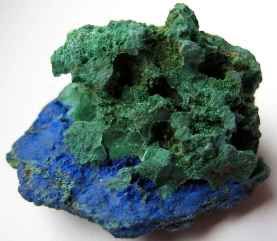 Descriere: Rezultat al alterării minereurilor de Cupru, este un mineral din acceași clasă cu Azuritul și de cele mai multe ori este găsit într-o formă masivă în combinație cu Azurit, Calcit sau Goetit. Foarte rar poate apărea și sub formă de cristale unice sau grupuri de cristale distincte, iar atunci când acest lucru se întâmplă acestea pot fi aciculare până la prismatice. Poate fi întâlnit sub formă de cruste, în druze, agregate sferice, globulare, noduli sau mase compacte. Există surse arheologice care atestă faptul că acest mineral a fost exploatat în urmă cu 3000-4000 ani în Israel și Egipt, fiind utilizat atât ca piatră prețioasă cât și ca element ornamental. A fost folosit ca pigment mineral în vopsele din antichitate până în secolul XIII când a fost înlocuit cu compușii sintetici.