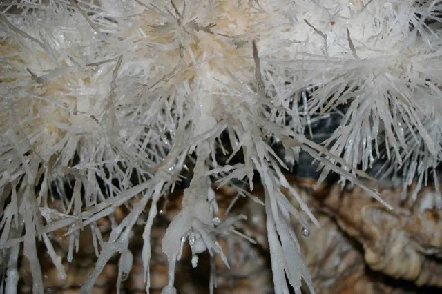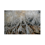 - Mineralul alb, Aragonitul, se găseşte deseori în mase ramificate ce arată ca şi coralii marini, dar şi ca brăduţii.