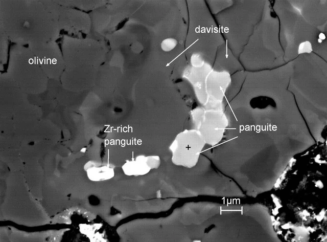- Panguit - Este un mineral descoperit de curând de către Chi Ma, director la Geological and Planetary Sciences division’s Analytical Facility din cadrul California Institute of Technology. In urma studiilor efectuate asupra meteoriților, cu ajutorul microscopului electronic, cercetătorul a identificat mineralul ca incluziune a Meteoritului Allende si l-a descris pentru prima oara în anul 2012. Panguitul este un oxid de Titan care mai contine in formula sa chimică și Scandiu, Aluminiu, Magneziu, Zirconiu, Calciu și Oxigen. Denumirea acestui mineral a fost dată după Pan Gu, personaj al mitologiei Chineze, gigantul paros care a separat energiile Yin și Yang cu o lovitură a uriașului său topor creând astfel Cerul și Pământul. Mineralul este considerat ca fiind unul dintre cele mai vechi minerale din Sistemul Solar.